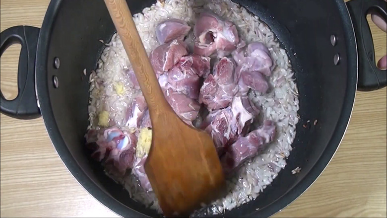 سپس گوشت را همراه سیر به آن اضافه کنید و 3 دقیقه سرخ کنید.