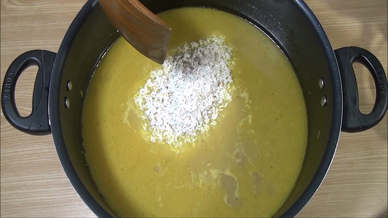 سپس یک پیمانه برنج را که قبلا به مدت 2 ساعت در آب گذاشته ایم را به مستاوه اضافه کرده و 15 دقیقه دیگر پخته می کنیم.